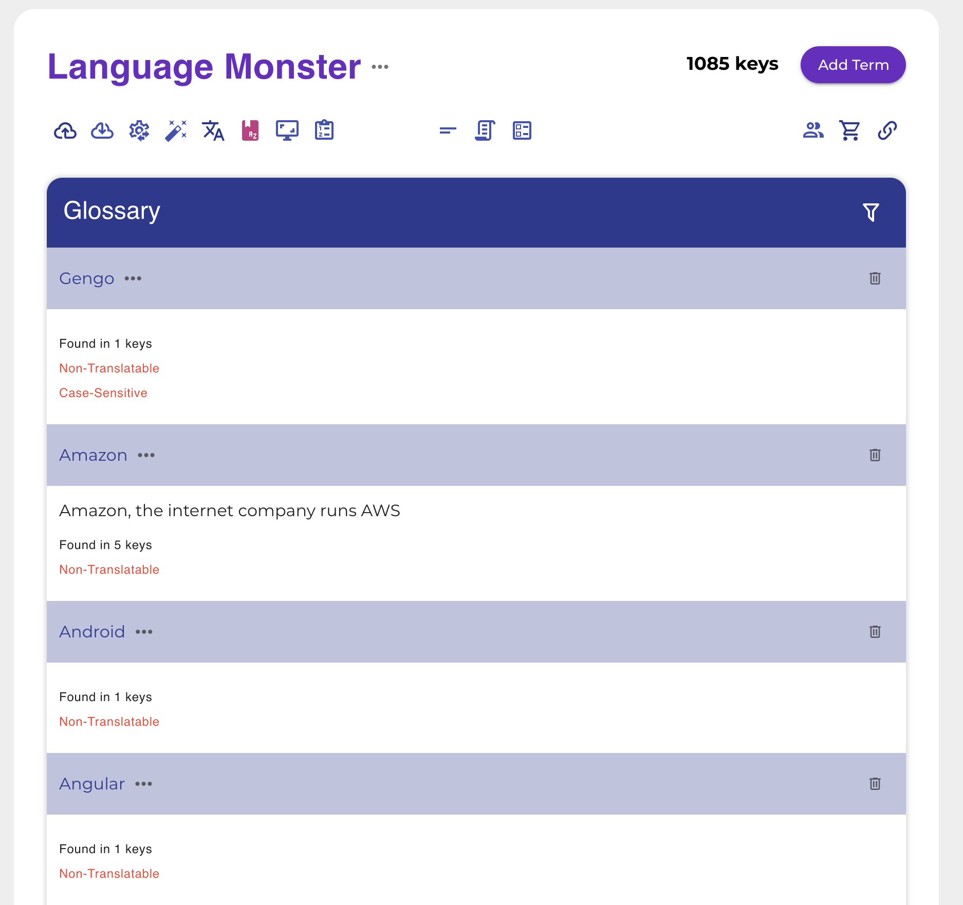 Language Monster's glossary lets you define a curated list of approved terms and their translations in every target language. When a translator works on a string containing a glossary term, that term is highlighted inline and the approved translation is shown immediately — no searching, no guessing. Terms can be marked as required, meaning the approved translation must be used, or advisory, meaning the suggestion is offered but the translator can adapt it if context demands.